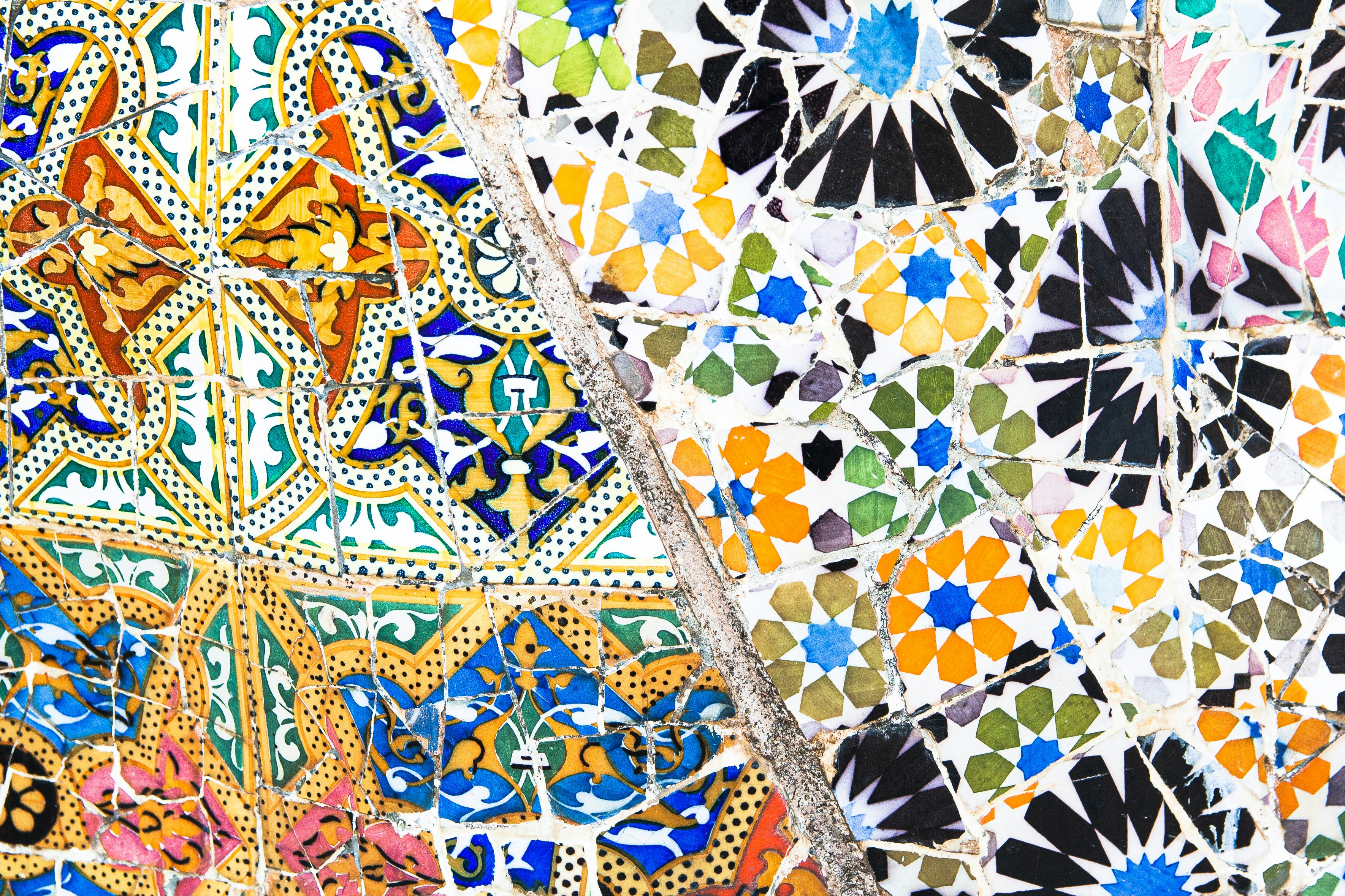 頭由四塊顏色組成,紅色、淺藍色、橘色、綠色,每塊顏色猶如從單色色紙撕下來的不規則塊狀紙片。