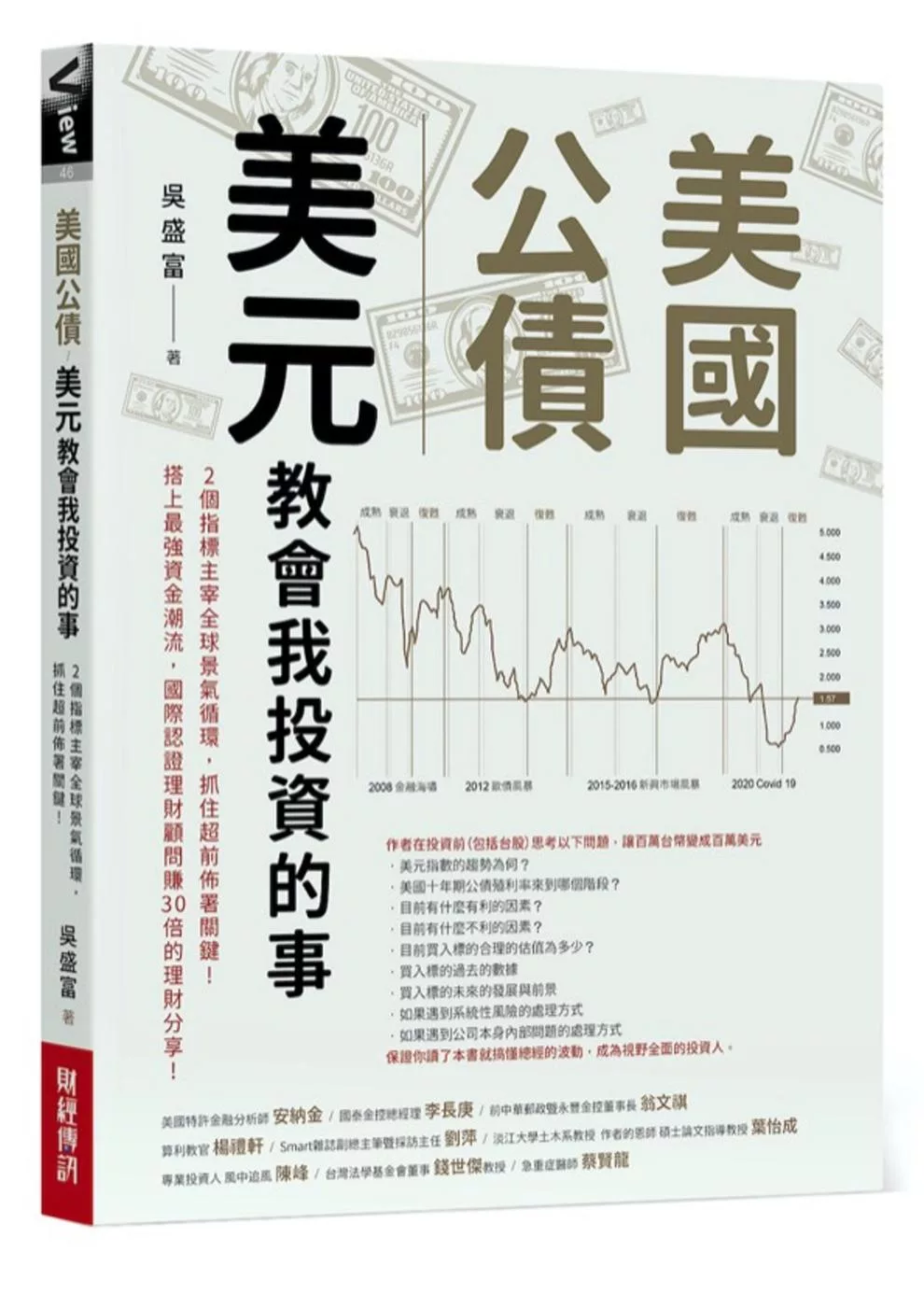 作者吳盛富是專業的理財規劃顧問CFP,曾經出版保險書籍以及台美股量化選股分析,其網站JUST CAFÉ也是很棒的財經資訊學習園地,本次作者推出新作,告訴讀者如何透過美元及美國公債利率來決定資產在不同經濟條件下該如何配置,並提出其在2019年COVID-19時如何帶領他的客戶做出投資決策在困頓的情況下做出穩健決策,逆勢獲取報酬。