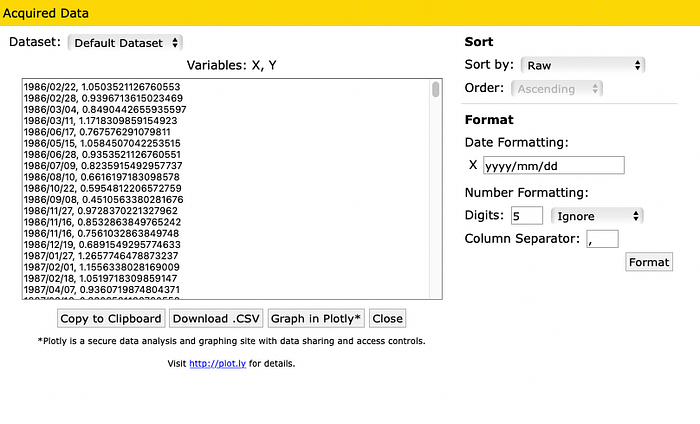 8. 點選左邊 View Data 準備匯出數據。這邊可以選擇用不同的符號分隔欄(對寫程式比較方便),但因為我要用 Excel 製圖所以就都沒有改,直接 Download .CSV