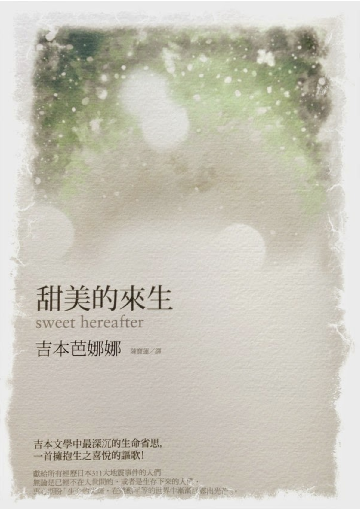 日本 311地震發生之後,吉本芭娜娜決定用自己擅長的文字撫慰人心,於是寫成了這本《甜美的來生》,但為了避免觸景傷情,她在書中完全沒有提及地震。然而,一如她過往的小說,這本書也涉及死亡,雖然死亡無處不在,但在這書中死亡卻是輕盈的,像書名要帶出的訊息一樣,死亡之後就是甜美的來生,而不管有沒有來生,活在當下就必須過得開心。