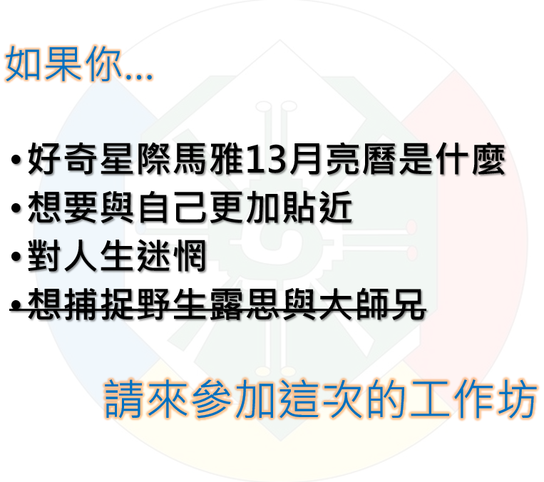 跟大師兄一起用直播跟大家分享了半年的13月亮曆知識,相信大家應該多多少少了解了一些關於這套曆法的知識,但是你知道該怎麼在生活中實踐它嗎? 又要怎麼透過這套曆法更了解自己呢? 這次的工作坊我將帶領大家利用這套曆法更靠近自己。