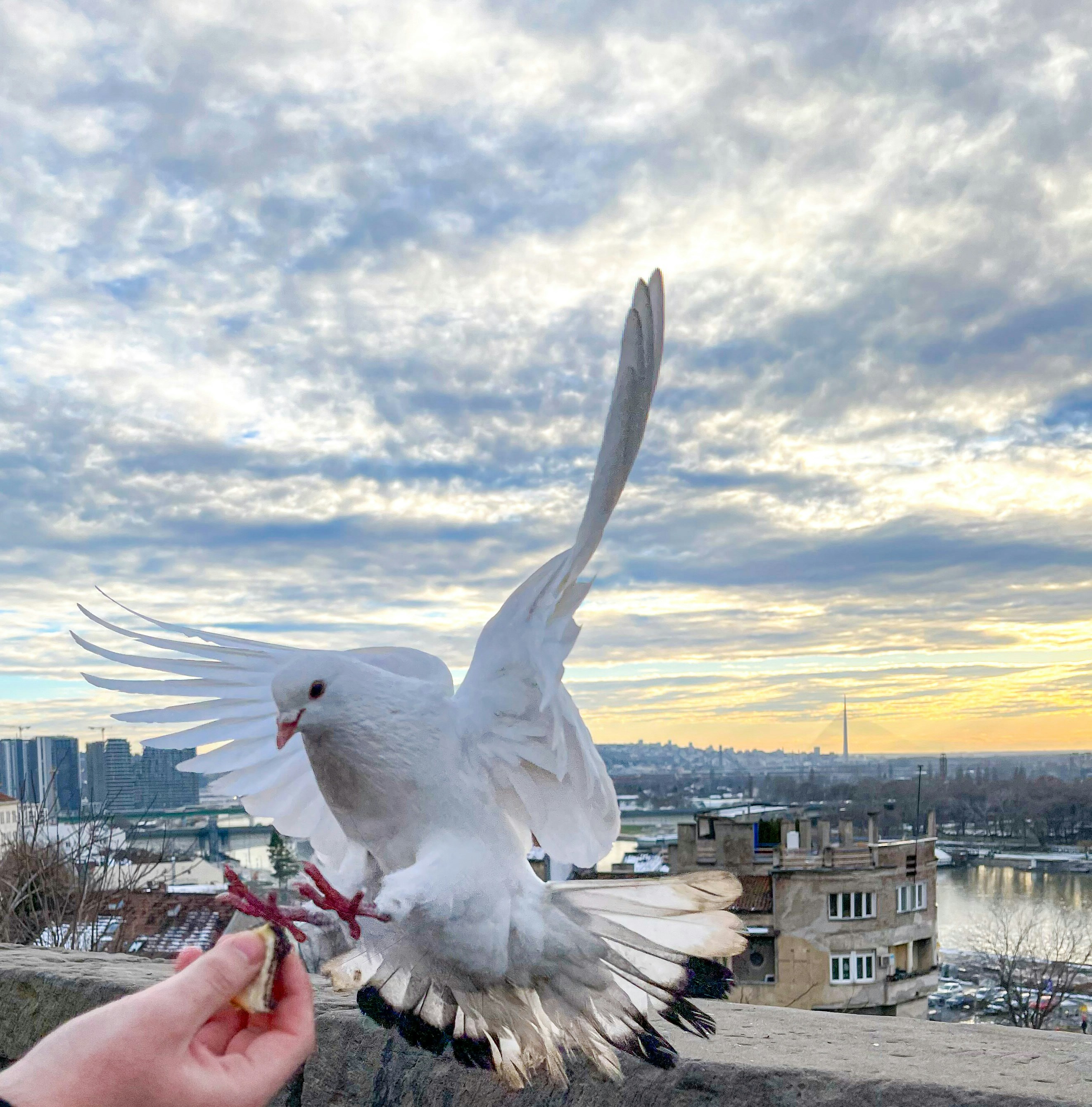 現在每天早上,都會有鴿子在雨遮上走動發出聲響,然後像是催促開飯的咕咕叫著,拉開窗簾時,就看鴿子站在窗台樹枝上盯著大叔等放飯,推開紗窗時鴿子會不情願地飛到鄰近的窗台,等大叔把飼料補滿後,才又飛回來吃。