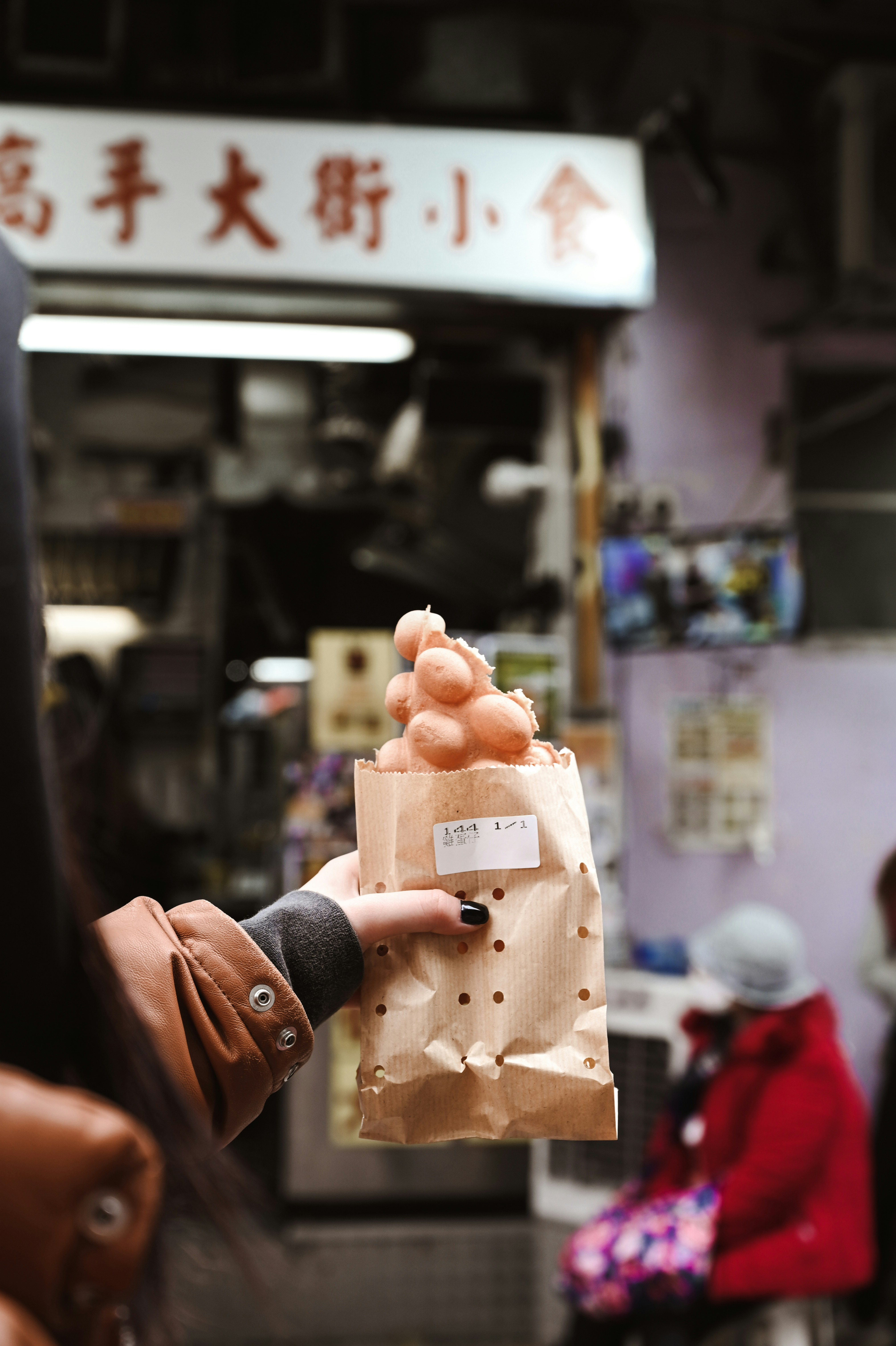 終於拿到手了,一整片雞蛋仔裝入紙袋中,可以看到雞蛋仔周圍會稍微有脆脆的邊。
