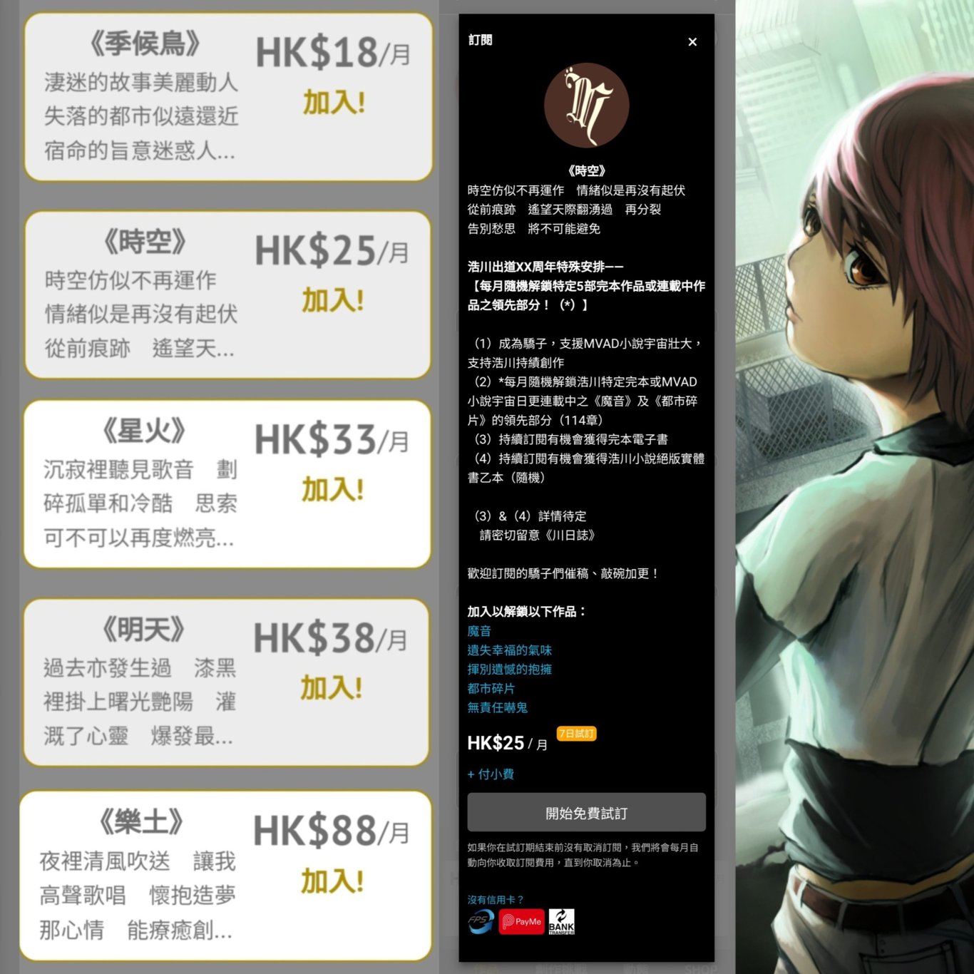 <...貼不了圖...>雖然,您們的訂閱及打賞等支持對浩川非常重要,因為說故事可算是我生活的全部了呢!但支持與否、支持的方式、訂閱計劃的選擇,應當是您們自由意志下的決定,所以相關資訊也該全讓您們了解清楚的!簡單來說,即是對於早已把除《魔音》及《都市碎片》以外所有川之作品都看完,又不需要永久閱讀相關作品的驕子,【時空】或許已能滿足您們的需要,您們可以退出原本已加入的訂閱計劃,轉而改投【時空】呢!
