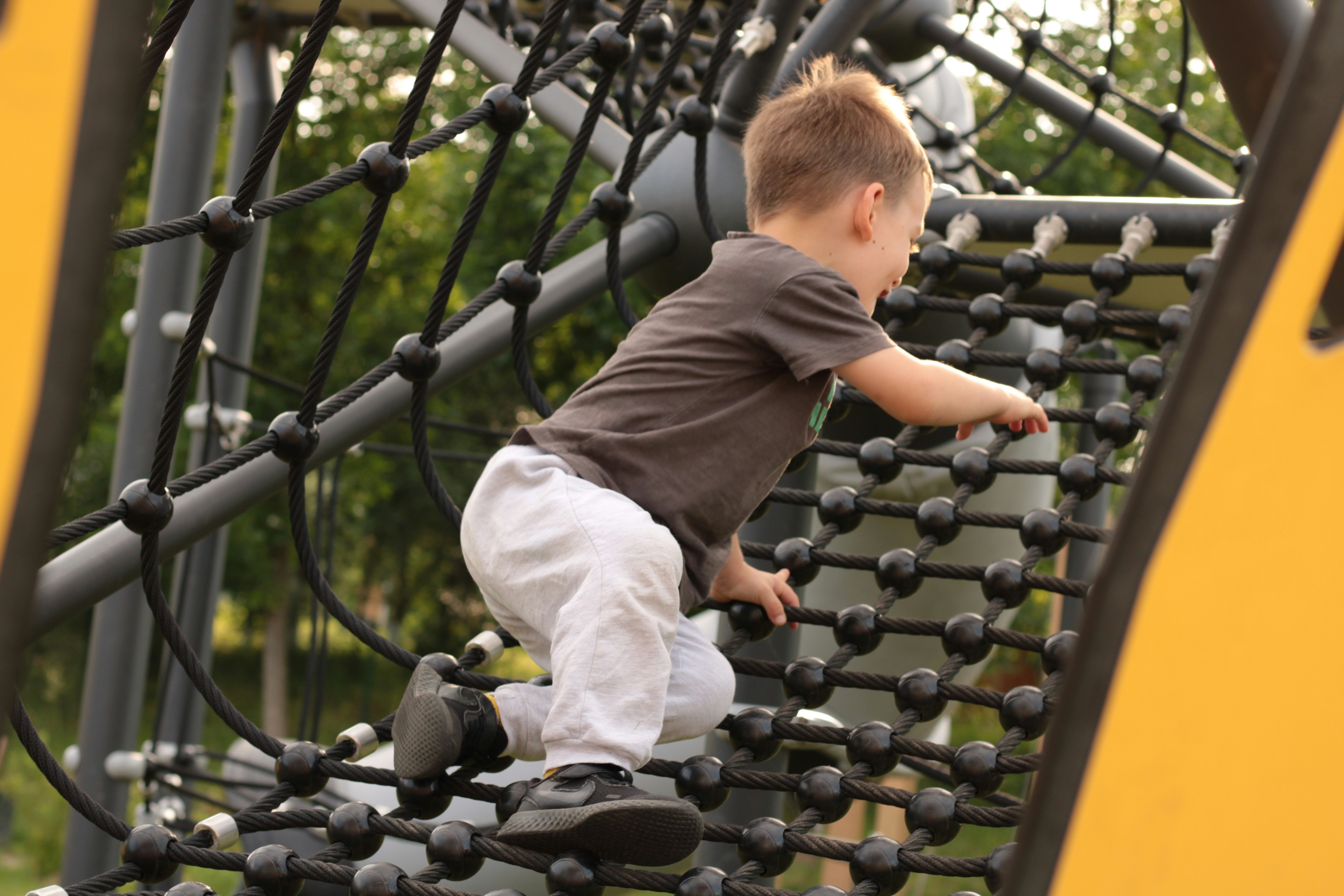 我喜歡家附近的公園。疫情前,它只是一座小小的罐頭溜滑梯,中間雖然改造過一次,但沒有特殊變化,一樣是階梯爬上去,中間一個小廊道,再從小滑梯溜下來。疫情後,它被工地布條圍了一段時間。當重新開放時,整座公園煥然一新。它不像共融公園的溜滑梯那麼花俏,卻充滿巧思:地板換成兒童專用的緩衝地墊,溜滑梯變成一高一低,一個適合高年級小朋友,另一個適合小小孩。高溜滑梯設計了三種進入方式:第一種是有弧度傾斜的攀爬繩索、第二種是一般的鐵製階梯,一格一格爬上去(2-3歲就可以挑戰)、第三種是倒U型的緩坡攀爬牆,上面有半圓形踩踏板(3-4歲小孩就可以駕馭)。這樣的設計,讓年紀、性格、能力差異很大的孩子都能找到適合自己的玩法。