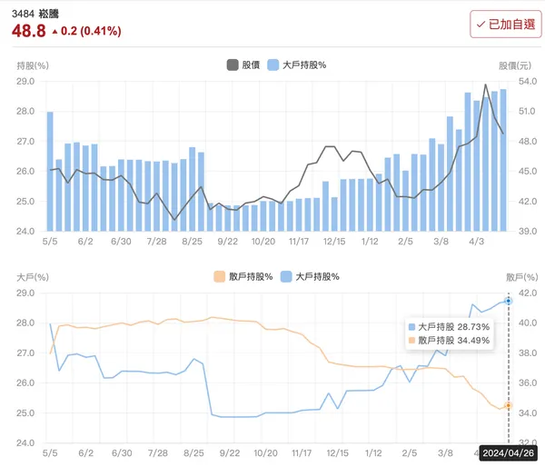 相隔12個月恢復超過3億元的營收,雖然是看是不起眼的進步,卻是營收重回成長態勢的重要訊號,結合毛利率的改善,對EPS的貢獻將更加凸顯。長短期營收曲線反轉向上,且大戶、外資籌碼都有增加的趨勢,對崧騰的股價來說都是一個加分項。