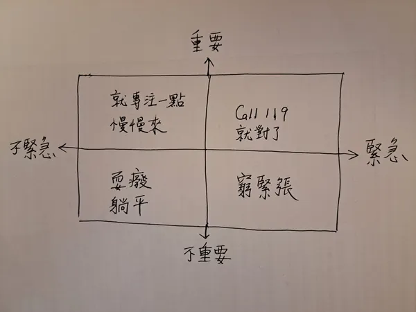 馬力催到一百,長途開下去,遲早沒油,人生不像交通,會有速限,違規拍照,但有潛規則、世俗眼光、社會文化,那就像速限標誌,需要眼觀四面耳聽八方,避免出事,真正的高手並非飆仔;換言之,分好輕重緩急,依序處理,提升效率,不用當路隊長被時間追著跑。
