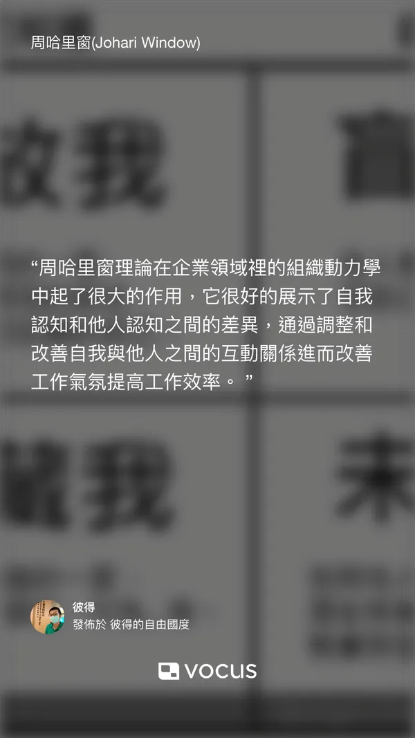 周哈里窗(Johari Window),這是學弟孝宇在臉書上提到的。 雖說是心理學範疇,但在企業管理裡頭有門課叫「組織行為」,也會研究這些。