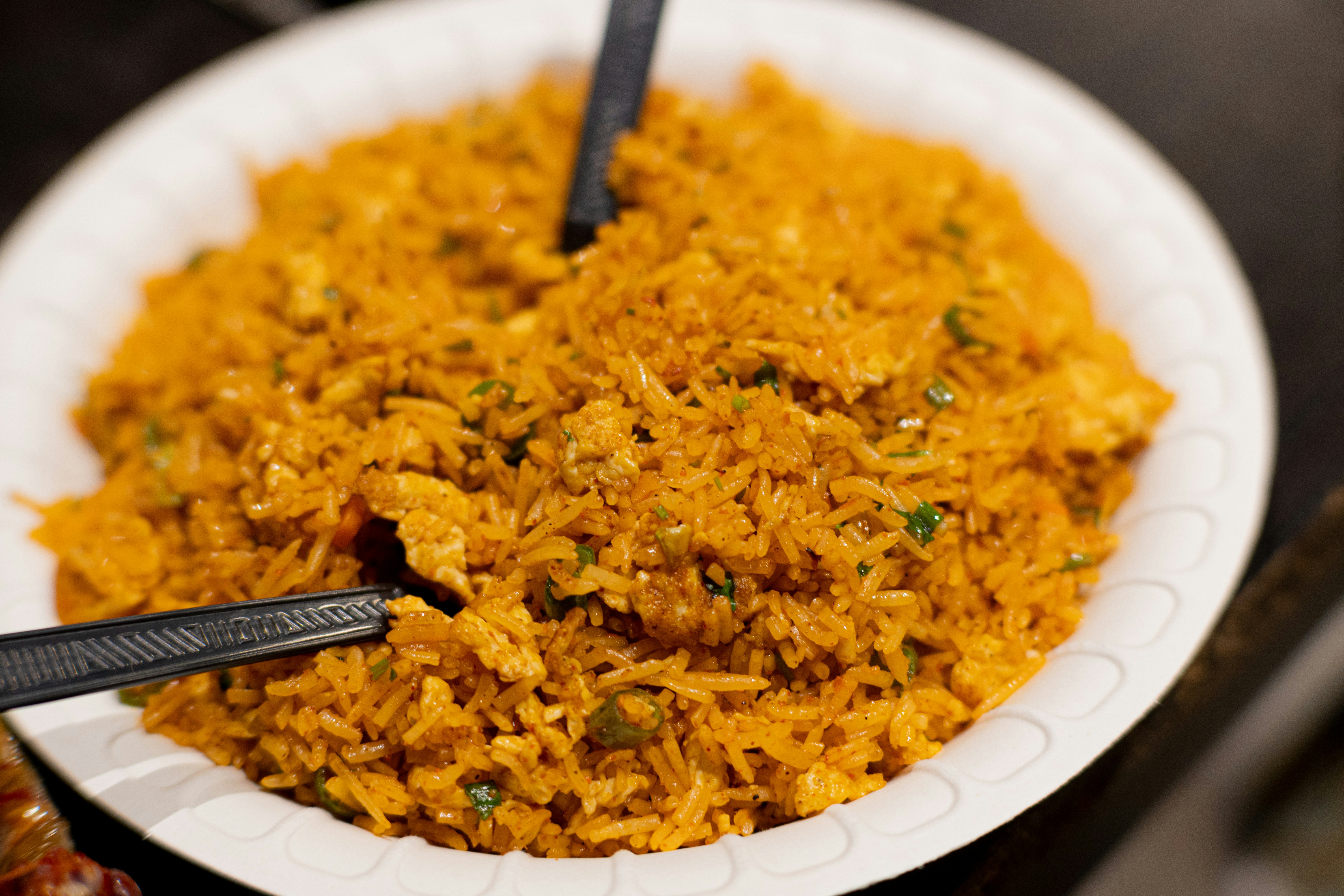 一邊俐落地把飯放進炒鍋中炒熱,再把和入些許鹽巴的蛋打散,均勻地淋上冒煙的米飯上;接著翻動鐵鍋,好讓裹在飯粒上的蛋液變成金黃色之後再關上火;最後在鍋邊淋上一點醬油和蠔油,把它們和已經炒好的飯拌勻後盛盤。