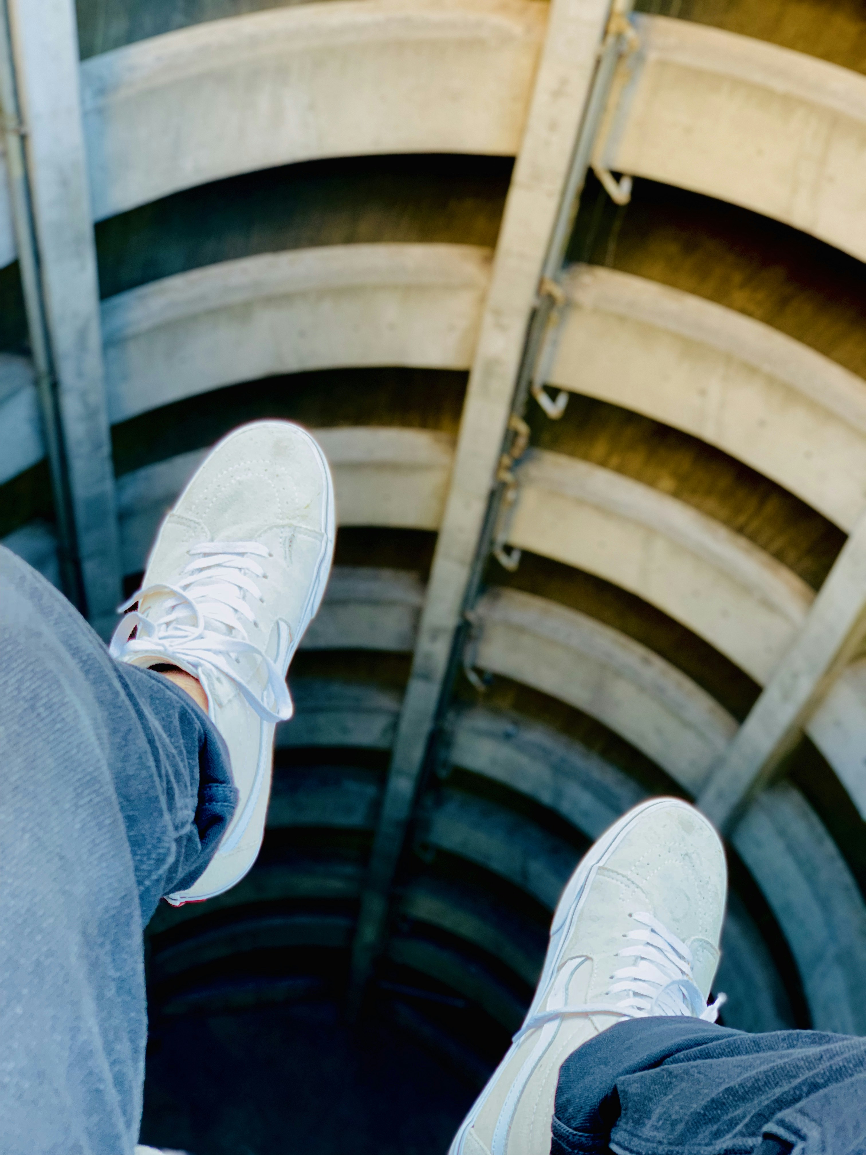 手扶圍欄,她一腳跨上,用力一撐,另一腳隨後抽起。