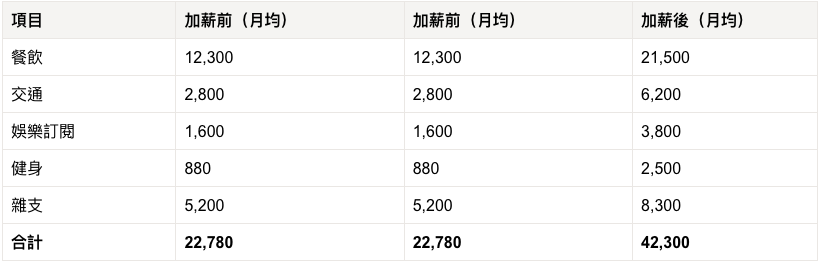 加薪30%,稅後大概多25,000。結果開銷多19,520,等於超過七成的加薪幅度,都被「生活通膨」吃掉了。