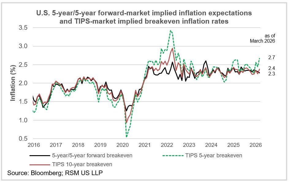 5 年期抗通脹債券 (TIPS) 的實質收益率已攀升至 2.7%,較戰事爆發前的 2.4% 明顯上揚。至於華爾街最青睞的通脹預期指標——「5 年遠期 5 年期平衡通脹率」(5-year/5-year forward breakeven)——目前報於 2.3%;而 10 年期 TIPS 的實質收益率則位於 2.4% (至2026/3/18)