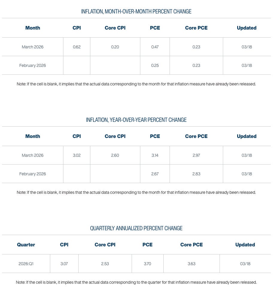 聯準會主席鮑威爾常常提到的PCE和核心PCE數據在2026/3/18時是長這個樣子。我們可以大致推測那些投機聰穎的賣方投行分析師會很方便的把今年降息兩次的預期再往後延,大概只有一、兩家比較敢持不同意見的會大幅修改預測。請大家問自己幾個問題:從2020年疫情之後,通膨這個多變的巨獸讓你們學到了什麼?美聯儲上次決策偏離市場預期是什麼時候?上次造成大幅市場調整又是何時?