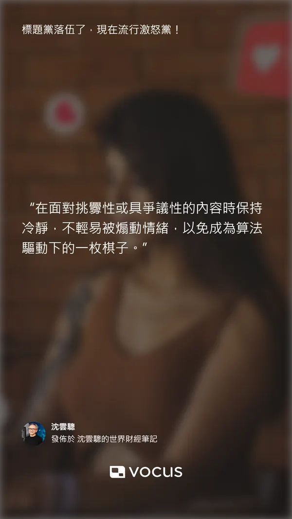 BBC不久前報導,現在有一種叫做「憤怒誘餌」(rage-baiting)的內容策略正在流行。這種策略與過去那種誘人點擊的標題黨(clickbait)不同,標題黨只是靠吸引你點擊標題來增加流量,而憤怒黨則更進一步,要利用人性對負面情緒的敏感反應來促進互動。